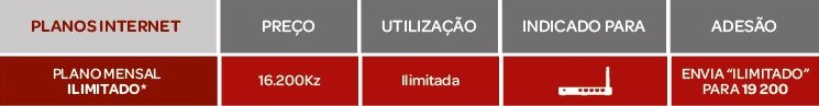 Nos últimos anos a Movicel investiu nas massas, trazendo planos de voz e internet para todos os bolsos. Os seus planos de internet não fazem distinção entre um dispositivo móvel ou um computador. Abaixo a tabela que mostra quanto custa a internet ilimida na Movicel.