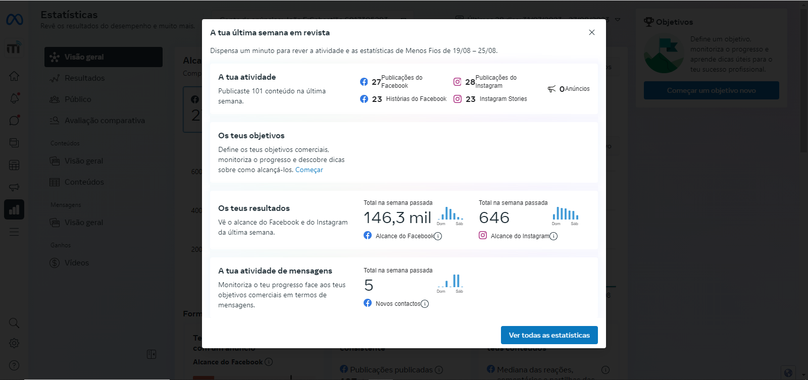 Outra das funcionalidades importantes é o módulo de estatísticas (Insights), que nos fornece um conjunto vasto de dados que nos permitem, certamente, melhorar a comunicação.
