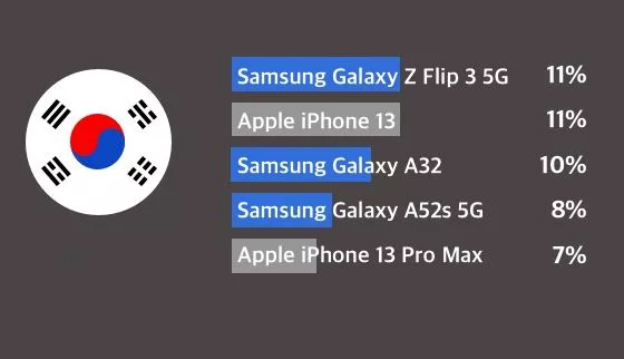 A concorrente Samsung assume o lugar cimeiro na Coreia do Sul, com o seu modelo Galaxy Z Flip 3 5G, e o Jio Phone Next conseguiu alcançar a mesma posição na Índia, percurso construído em apenas dois meses, já que tinha sido lançado em novembro de 2021.