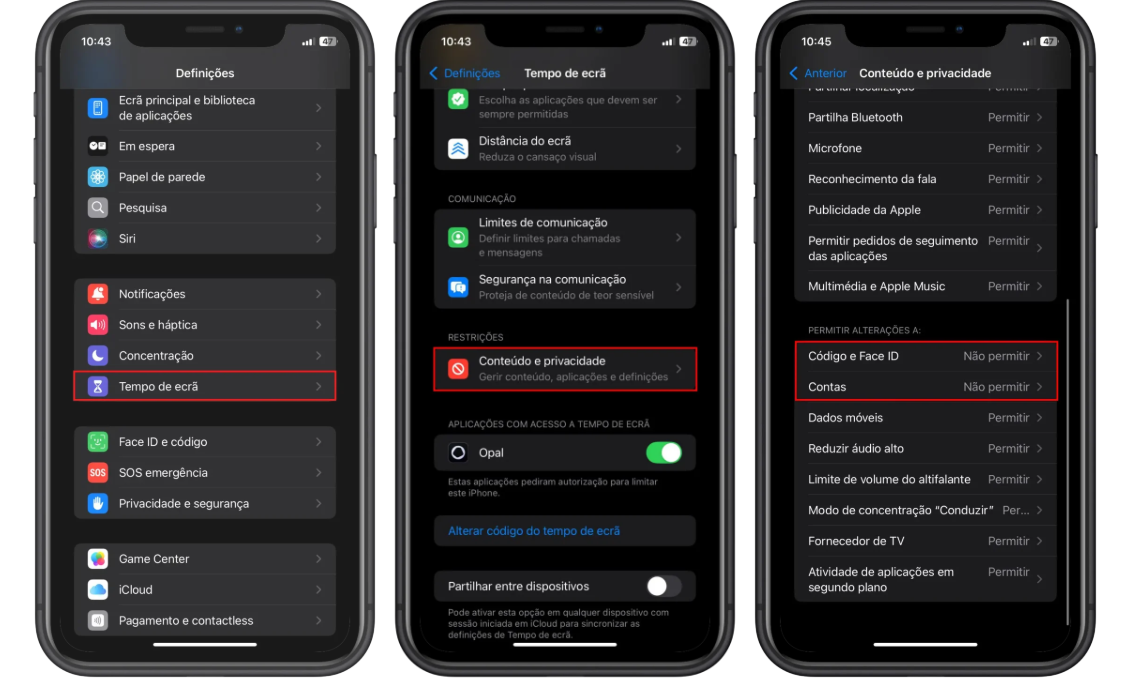 Abra as “Definições” e navegue até “Tempo de ecrã” > “Conteúdo e privacidade”. Ative esta opção e deslize até “Permitir alterações a:”. Selecione “Código e face ID” e defina como “Não permitir”. Repita o processo para as “Contas”. A partir deste momento, qualquer tentativa de editar estas secções exigirá o código do Tempo de ecrã.