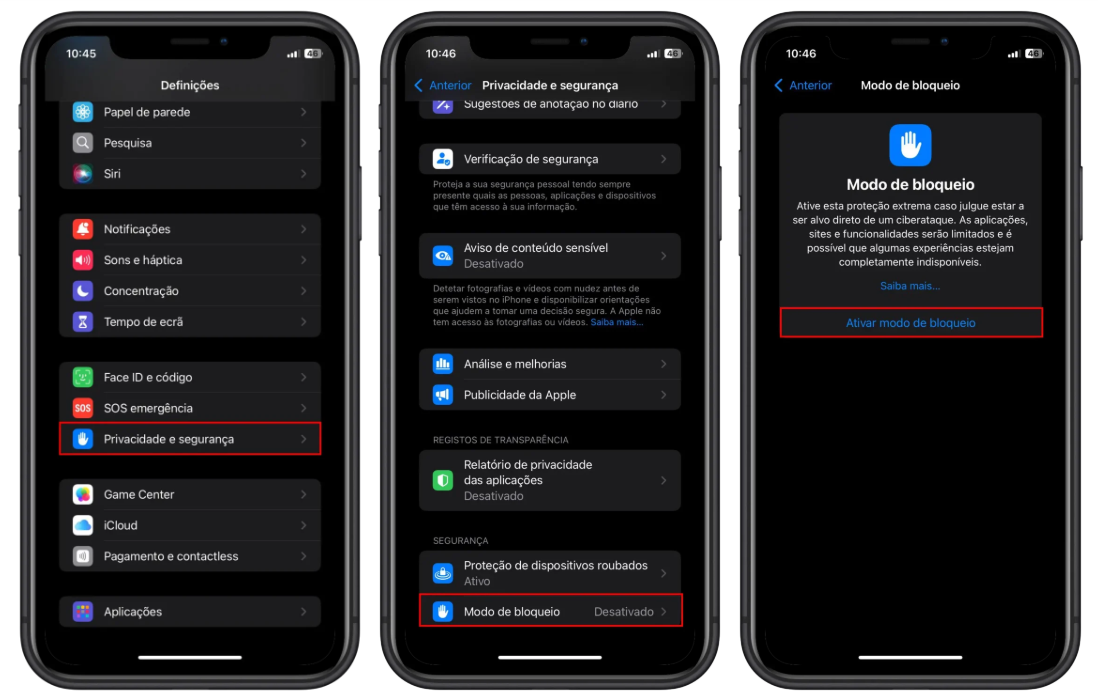 Quando activo, este modo restringe funcionalidades como a pré-visualização de links em mensagens, chamadas FaceTime de desconhecidos e ligações por cabo quando o smartphone está bloqueado. Embora não seja prático para o uso diário, é uma ferramenta valiosa para activar durante viagens ou ao lidar com informação sensível.