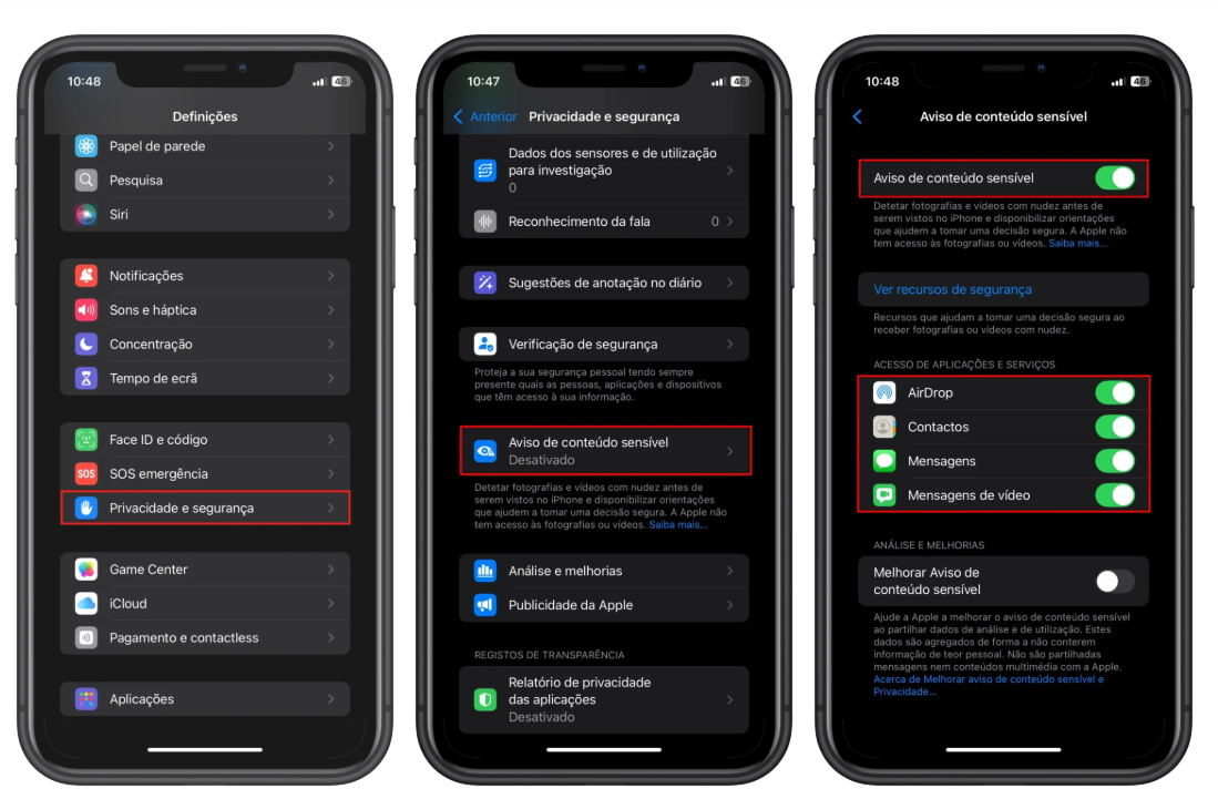 Para a configurar, aceda a “Definições” > “Privacidade e segurança” > “Aviso de conteúdo sensível”. Ative a opção e escolha as aplicações onde pretende que funcione. É particularmente útil para mensagens e AirDrop, mas também se aplica a mensagens de vídeo do FaceTime e a imagens de contactos.