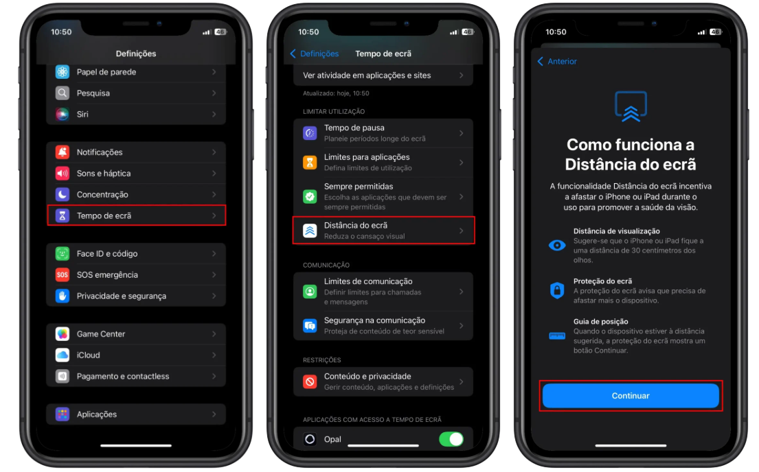 Para a ativar, abra as “Definições”, clique em “Tempo de ecrã”, escolha “Distância do ecrã” e ative a opção. Se mantiver o ecrã a menos de 30 cm dos seus olhos durante algum tempo, o iPhone exibirá um alerta. Basta afastá-lo e clicar em “Continuar”.