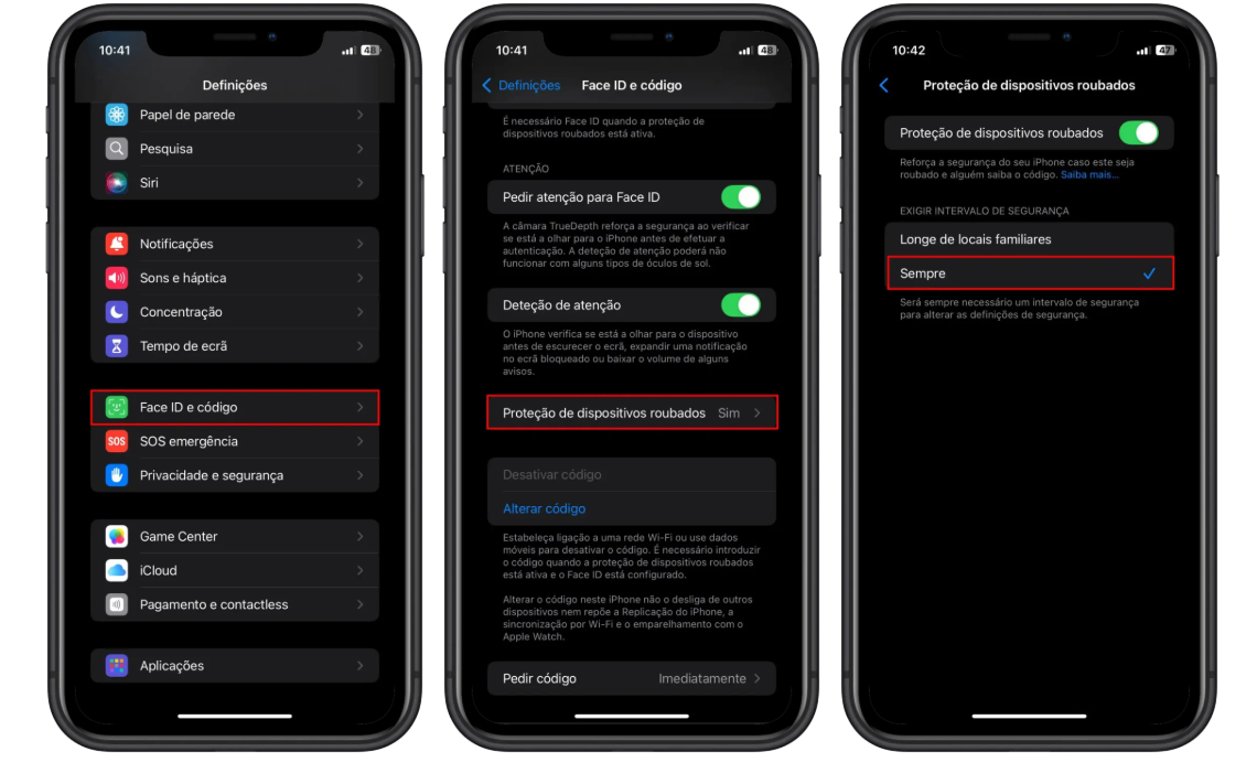 Para ativar, abra as “Definições” > “Face ID e código” e introduza o seu código. Deslize para baixo até encontrar a “Proteção de dispositivos roubados” e ative a opção. Para uma proteção reforçada em qualquer lugar (e não apenas longe de locais familiares como casa ou trabalho), na aba “Exigir intervalo de segurança”, escolha “Sempre”.